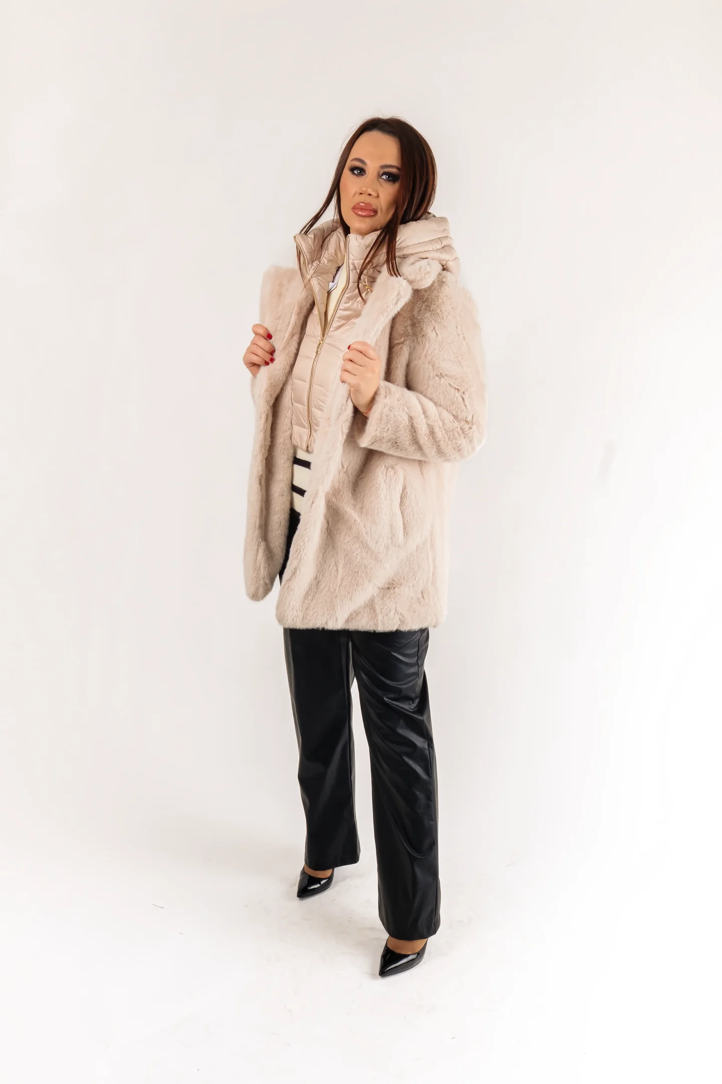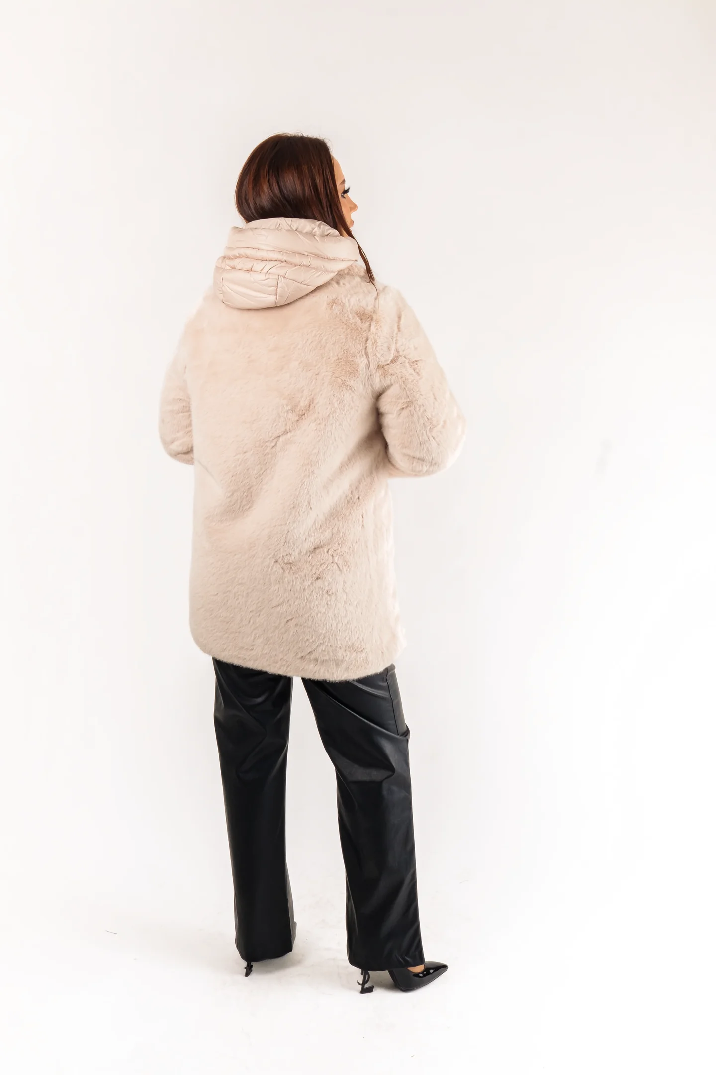 Materialul exterior din blană eco este moale, plăcut la atingere și oferă un aspect luxos. Croiala lejeră avantajează orice siluetă și permite asortarea ușoară cu pantaloni eleganți, jeans sau fuste. Este alegerea perfectă pentru ținutele de zi, plimbări în oraș sau evenimente casual-elegante.