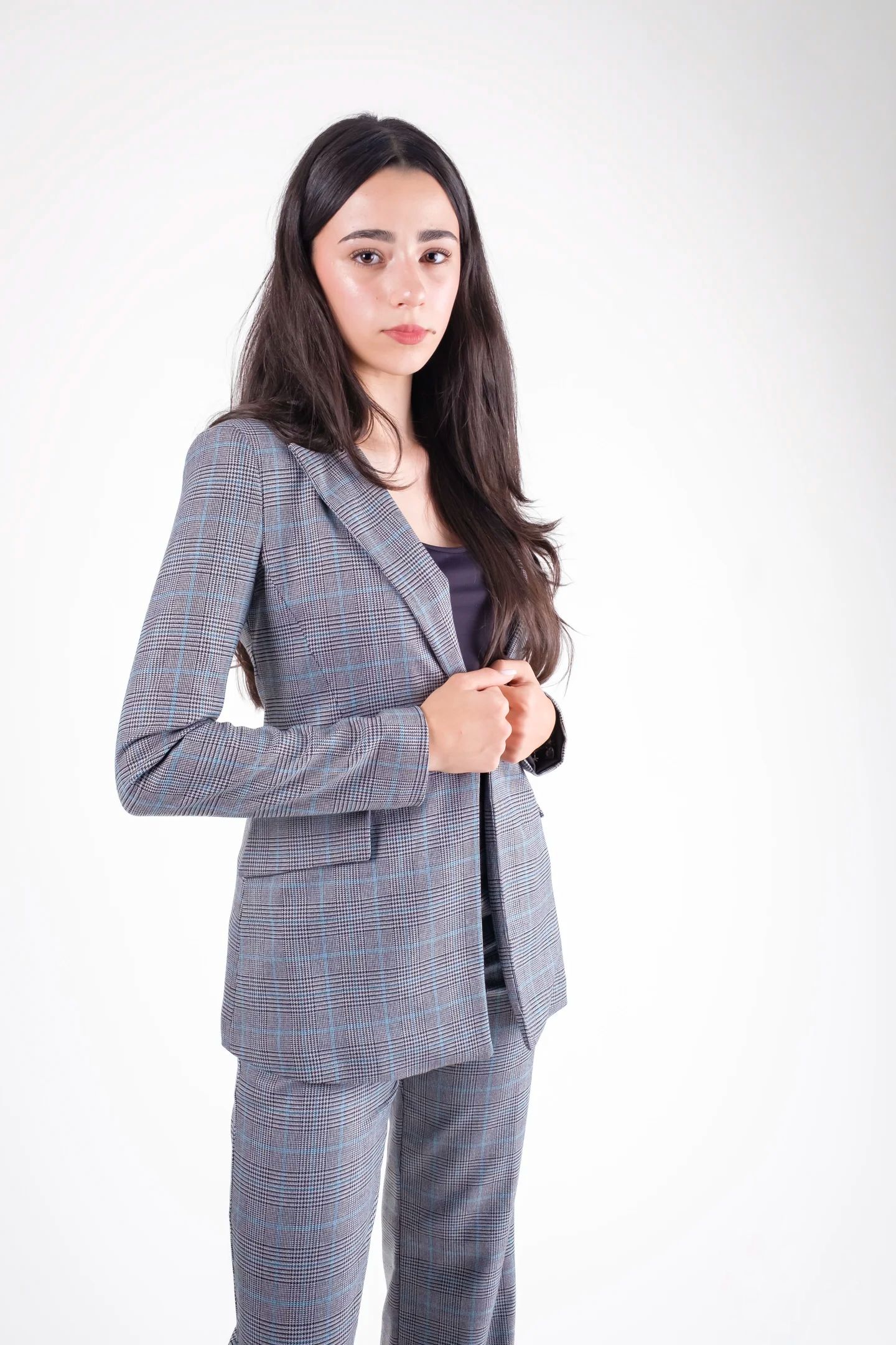 Costum damă din două piese, realizat dintr-un material fin cu imprimeu în carouri gri cu detalii albastre, creat pentru o siluetă elegantă și stil profesionist. Sacoul are croială cambrată, închidere cu un nasture și umeri structurați, iar pantalonii sunt cu talie înaltă și croi drept, oferind confort și alungirea vizuală a picioarelor.