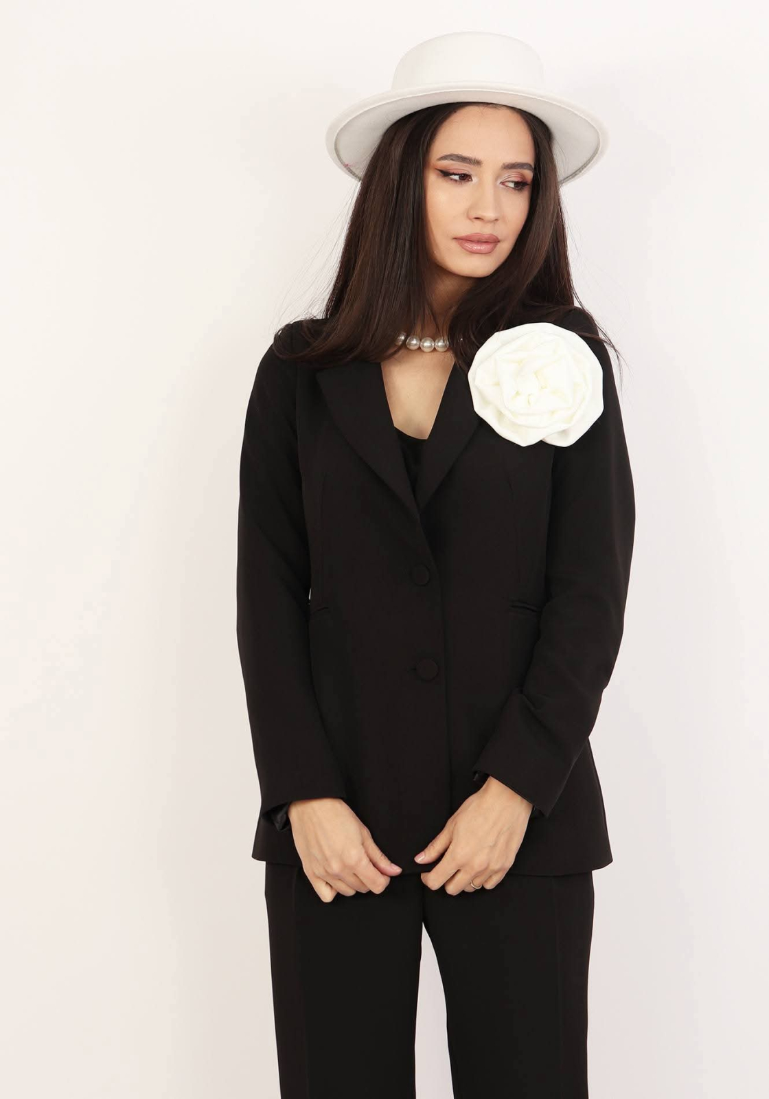 Sacoul are o croială ușor cambrată, ce evidențiază silueta, închidere cu nasturi și este accesorizat cu o floare albă decorativă, oferind o notă sofisticată și feminină.