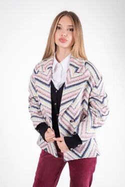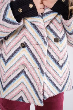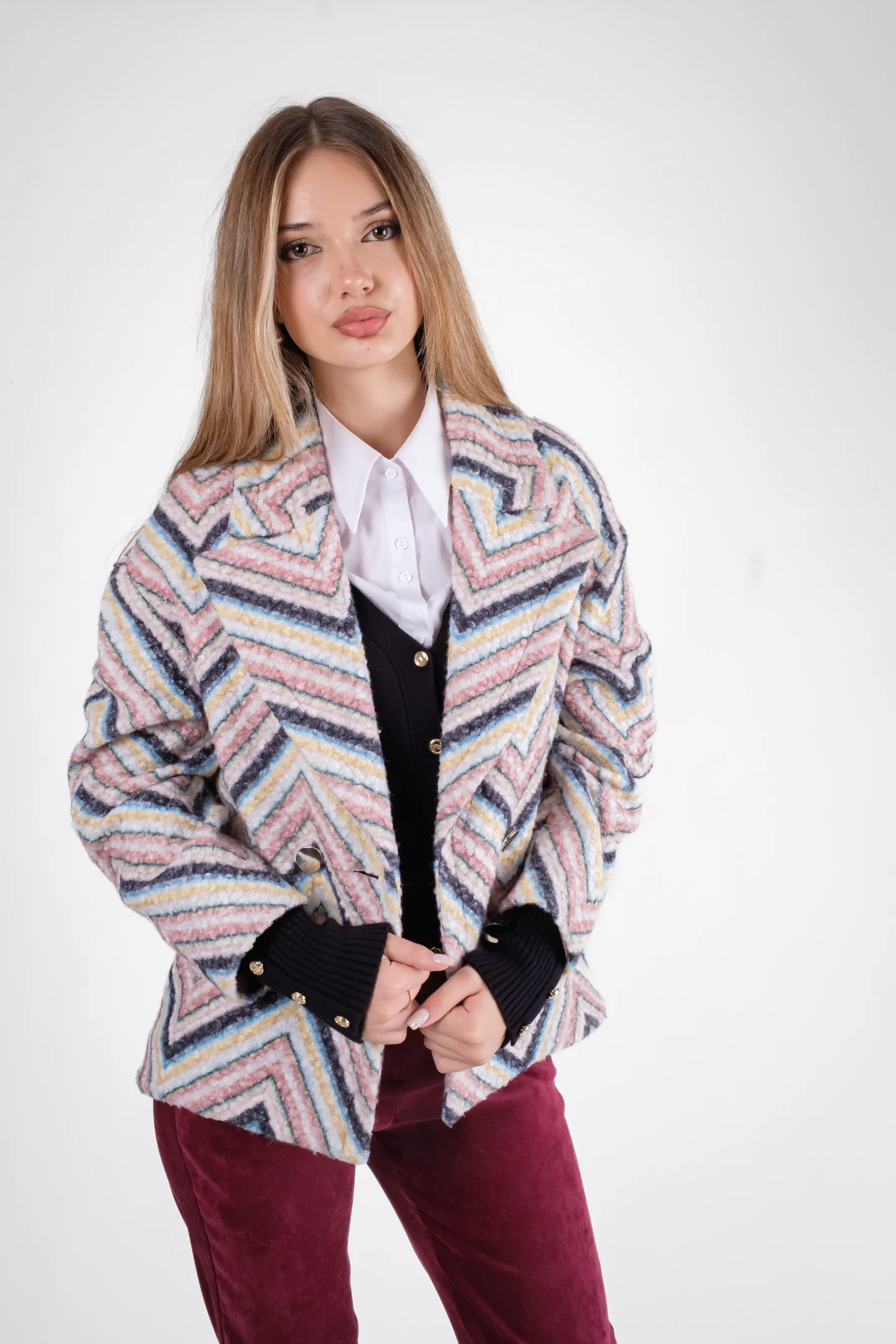 Această jachetă boucle cu imprimeu zig-zag este alegerea ideală pentru femeile care iubesc piesele moderne, confortabile și cu personalitate.