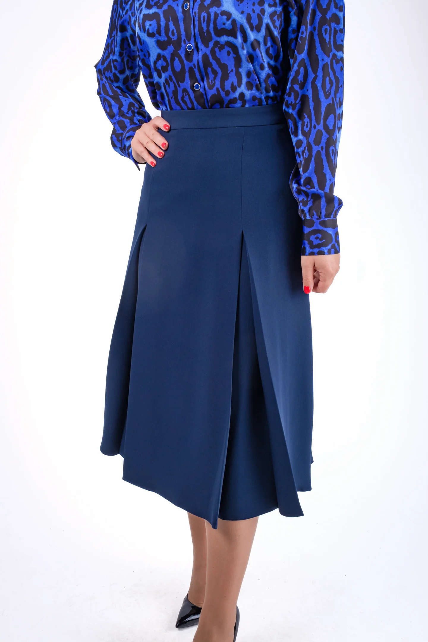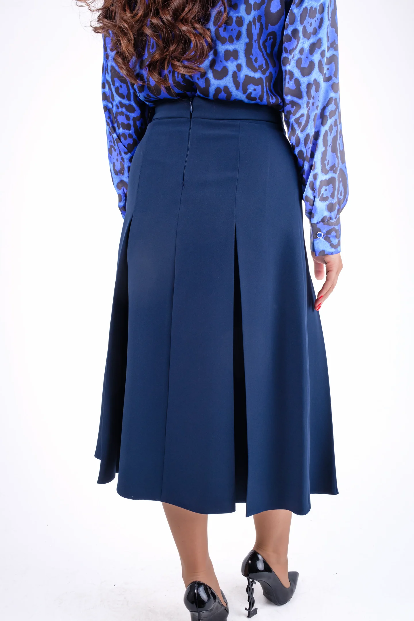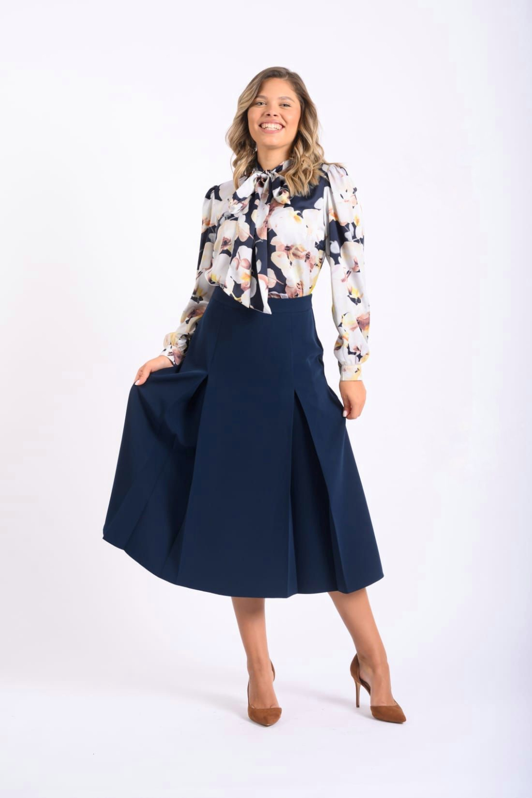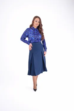 Această fustă midi este piesa perfectă pentru o ținută feminină, elegantă și bine structurată. Croiala evazată avantajează silueta, iar pliurile plasate în partea frontală și laterală oferă un efect elegant, cu mișcare fluidă la fiecare pas.