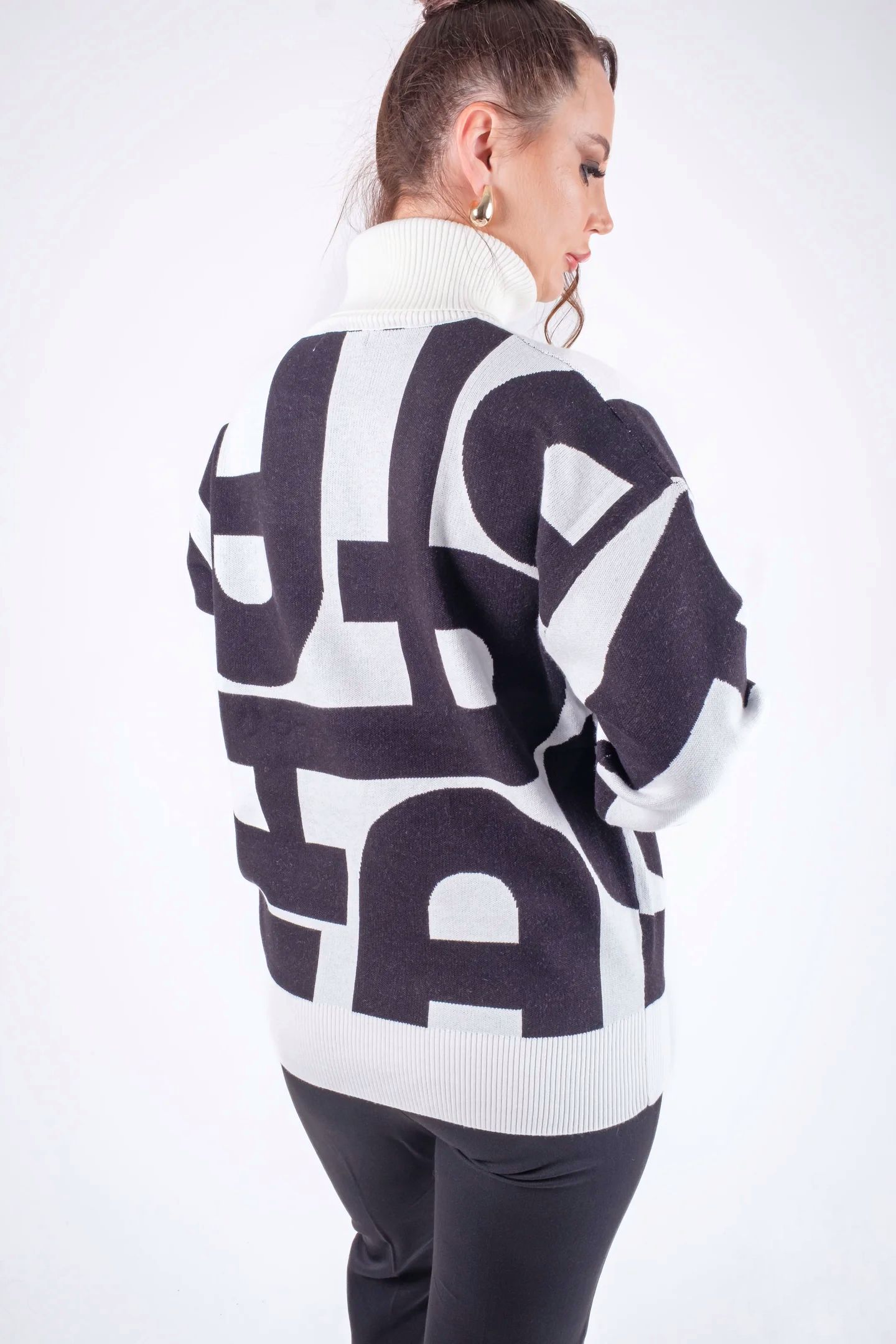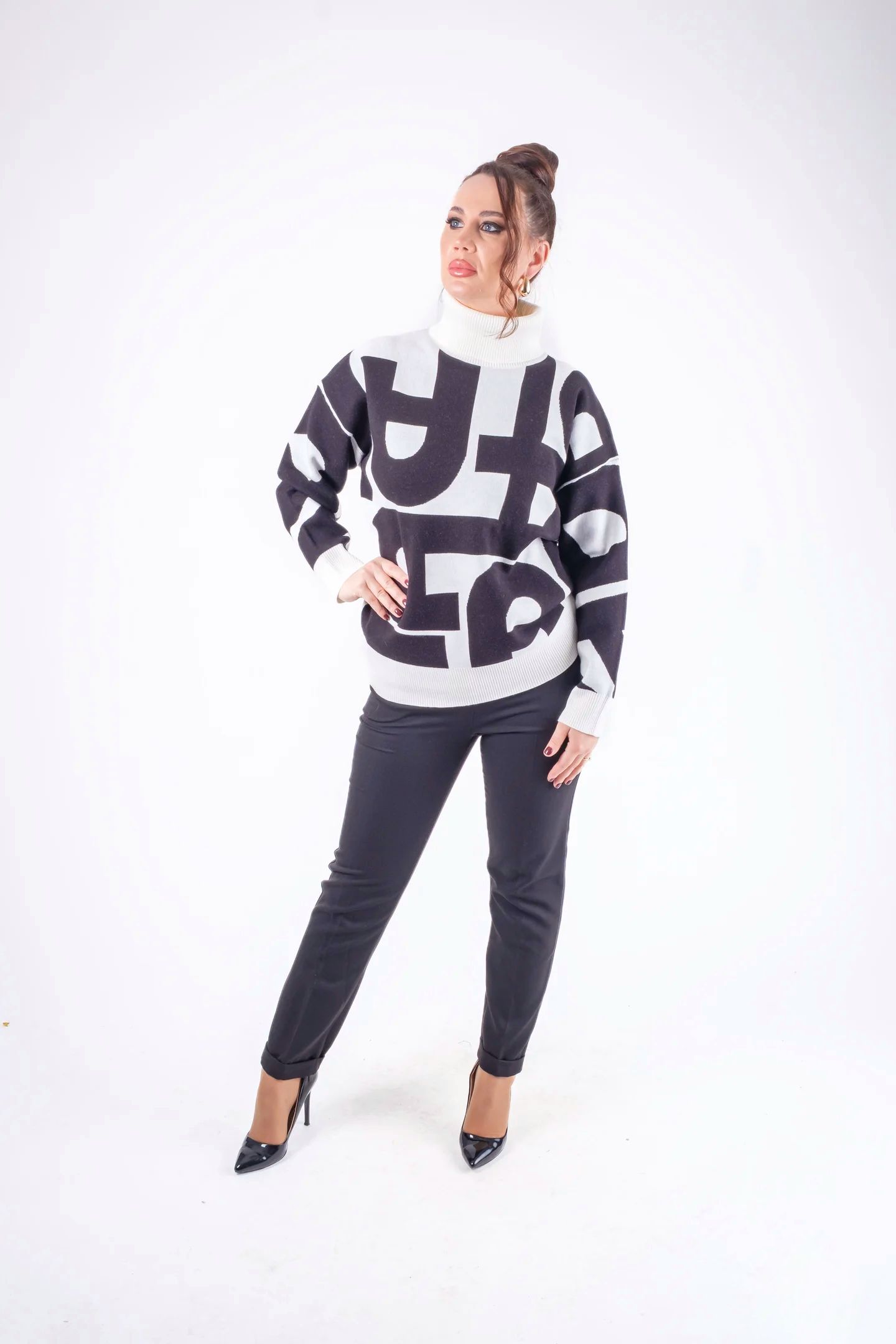 Puloverul dama Artigli impresionează prin designul său modern, cu imprimeu grafic alb-negru și croială lejeră, care pune în valoare orice siluetă. Gulerul înalt oferă un plus de confort și protecție în zilele răcoroase, fiind ideal pentru sezonul de toamnă – iarnă.