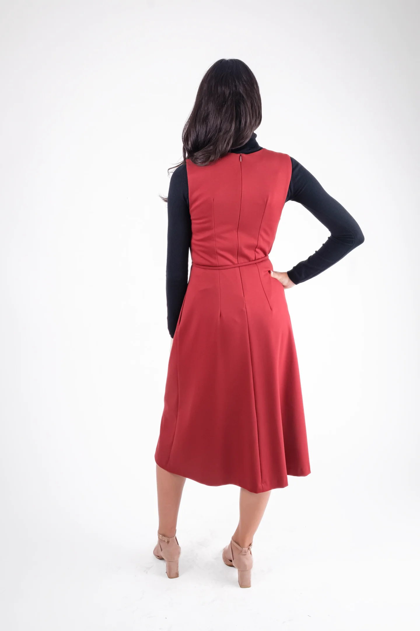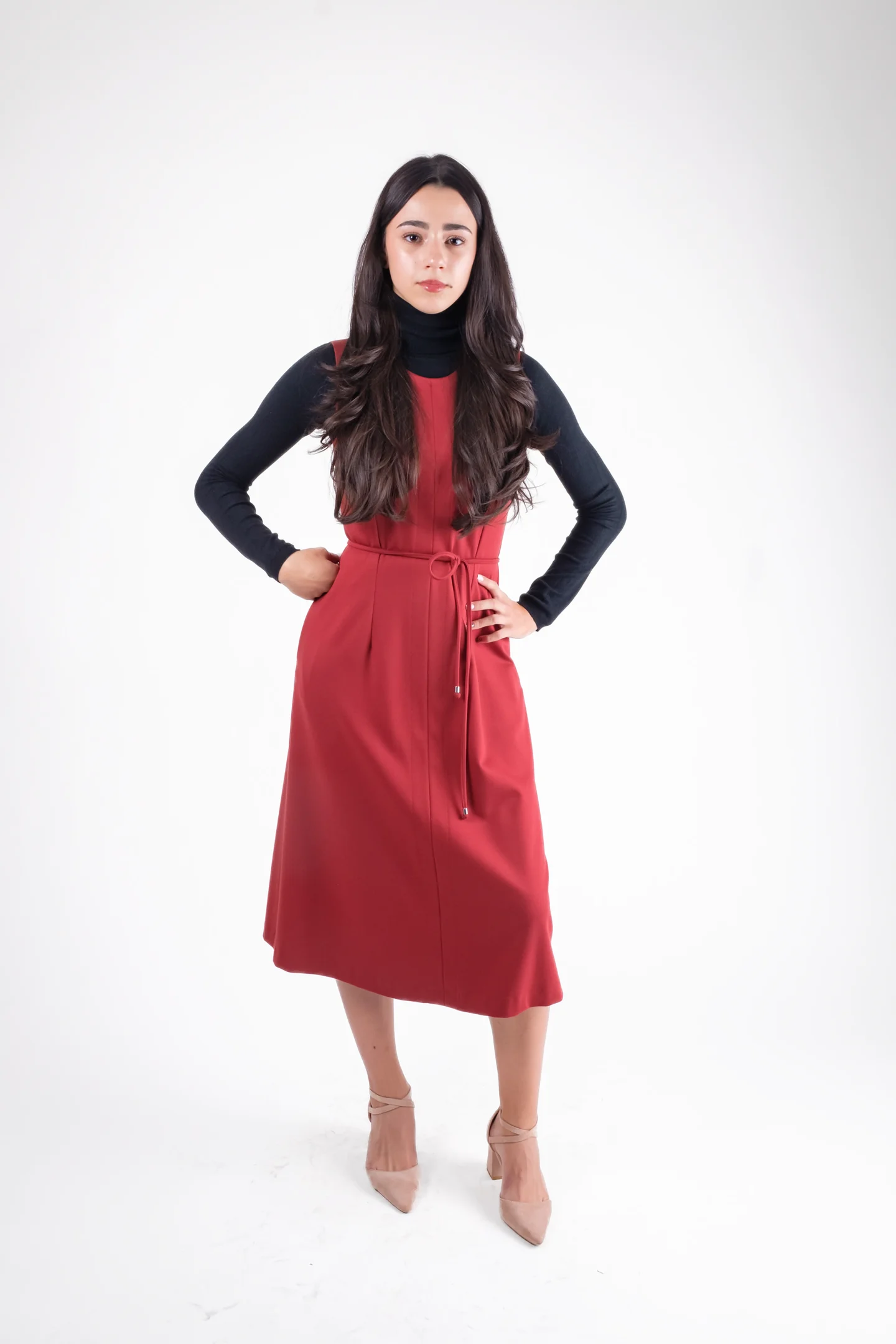 Acest sarafan midi din stofă este o piesă versatilă care nu trebuie să lipsească din garderoba sezonului rece. Realizat dintr-un material de calitate, cu o cădere frumoasă și plăcut la purtare, modelul are o croială feminină, integral evidențiată de șnurul subțire ce marchează talia într-un mod discret.