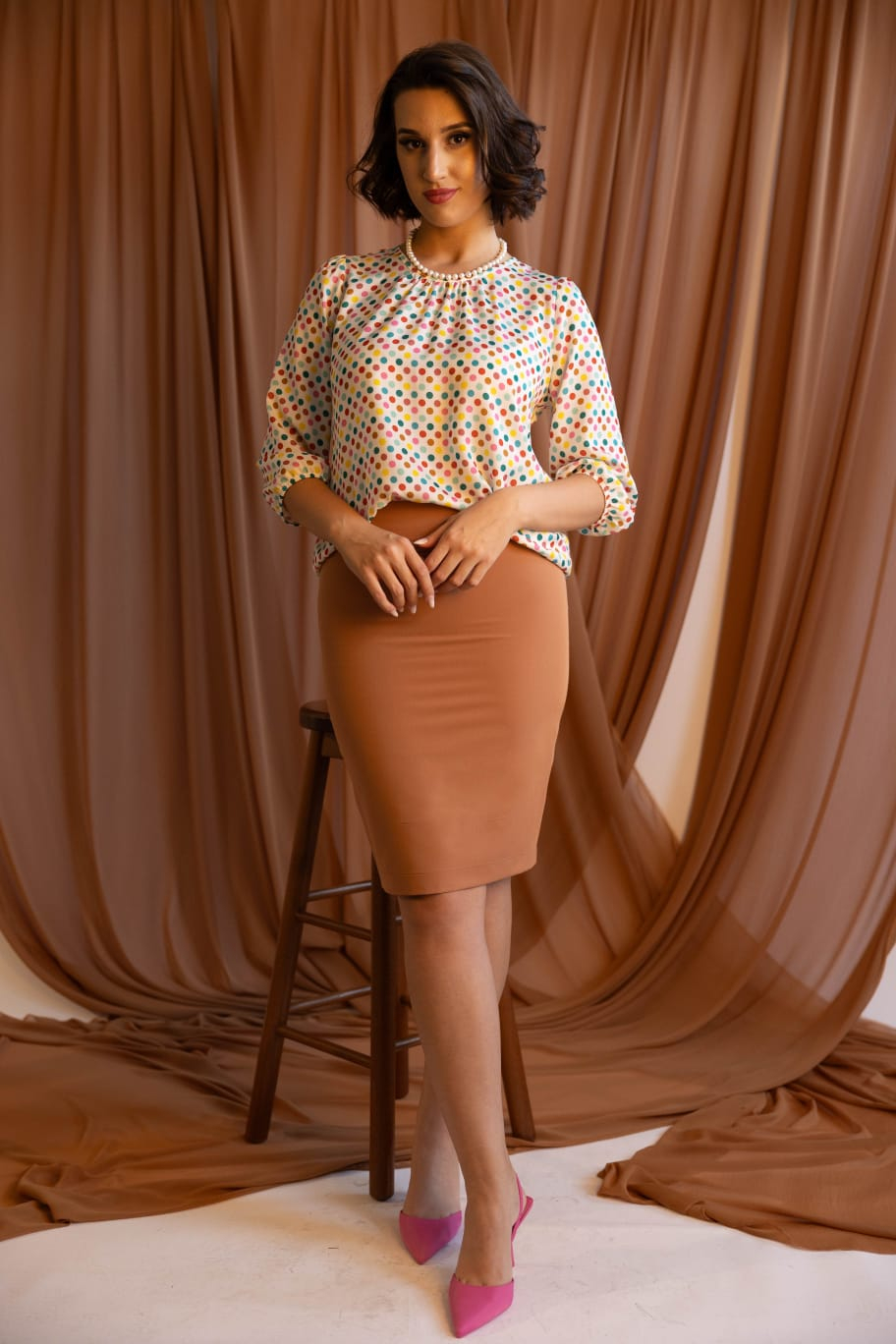 Această bluză elegantă din voal ușor și vaporos îmbină confortul cu stilul. Croiala lejeră și textura plăcută oferă libertate de mișcare, iar imprimeul cu buline colorate adaugă o notă jucăușă și modernă oricărei ținute. Se potrivește perfect atât cu fuste clasice, cât și cu pantaloni eleganți sau jeans.