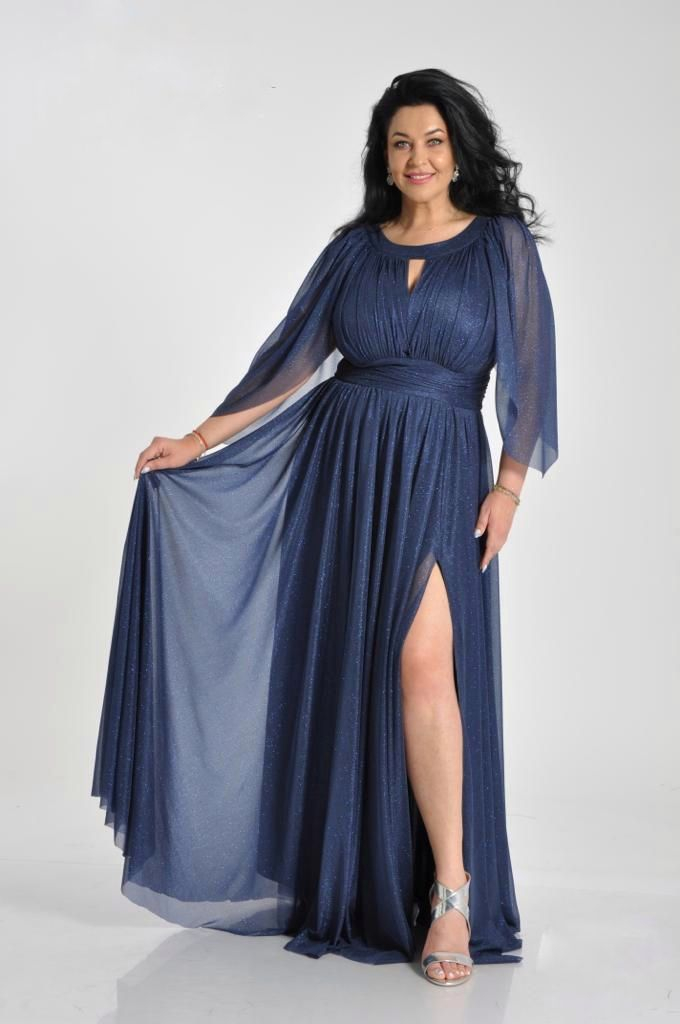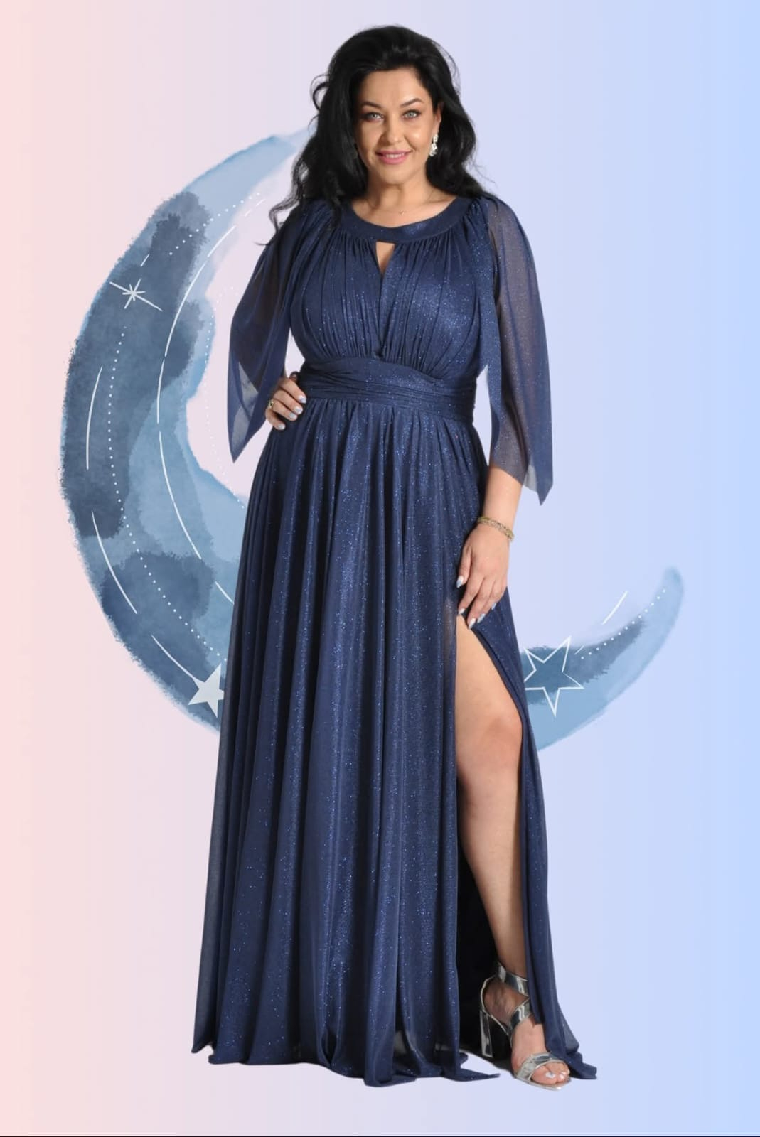 Rochie lungă de ocazie din voal bleumarin cu fir strălucitor, croită fluid și elegant, ideală pentru evenimente speciale.