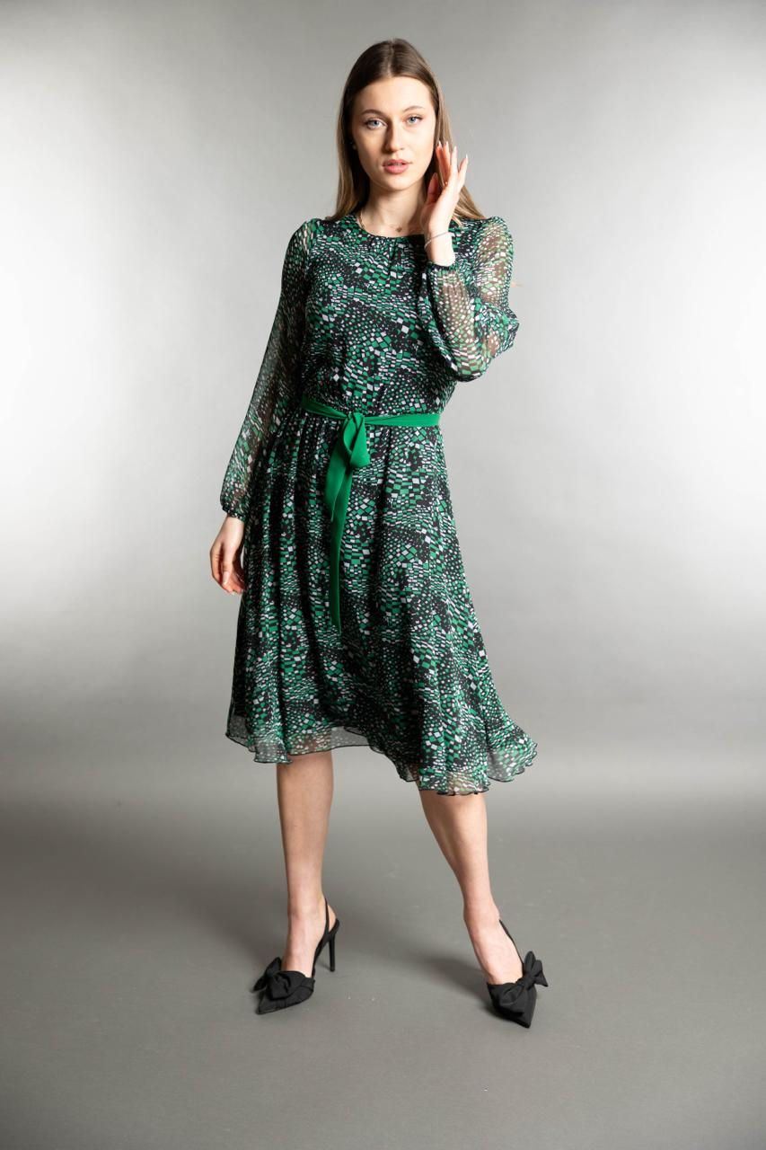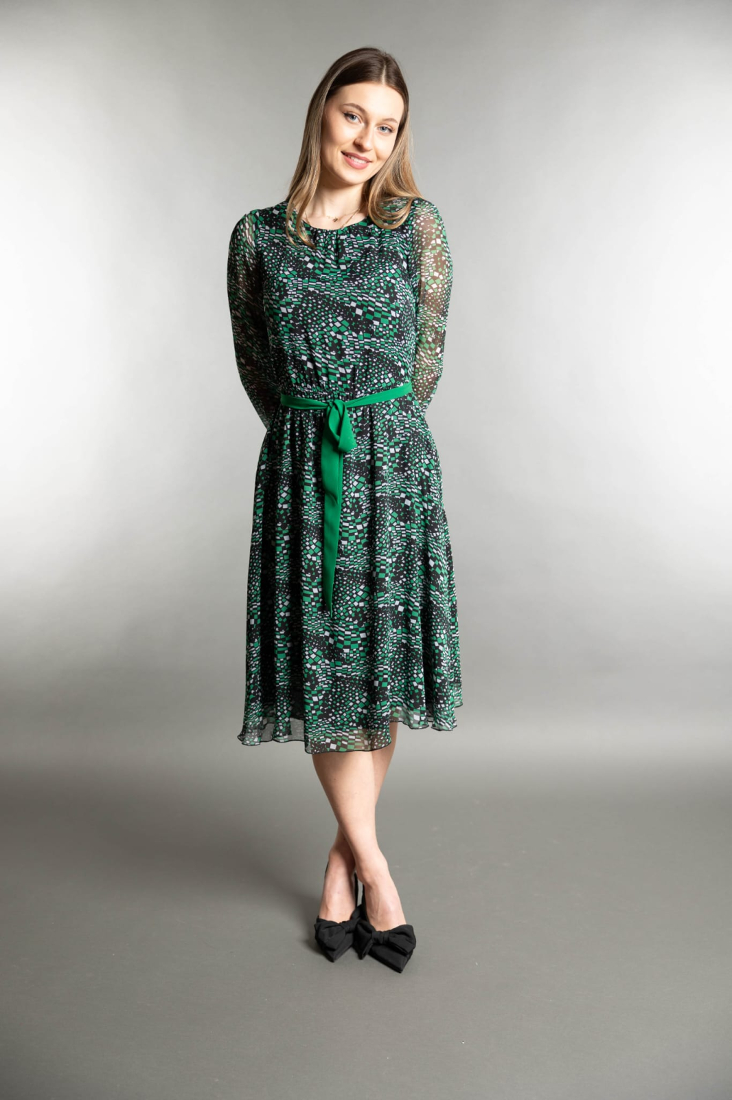 Rochie midi realizată din material ușor și vaporos, cu imprimeu geometric modern și detalii feminine. Cordonul din talie evidențiază frumos silueta, iar mânecile lungi, ușor transparente, adaugă un plus de eleganță și rafinament în mișcare.