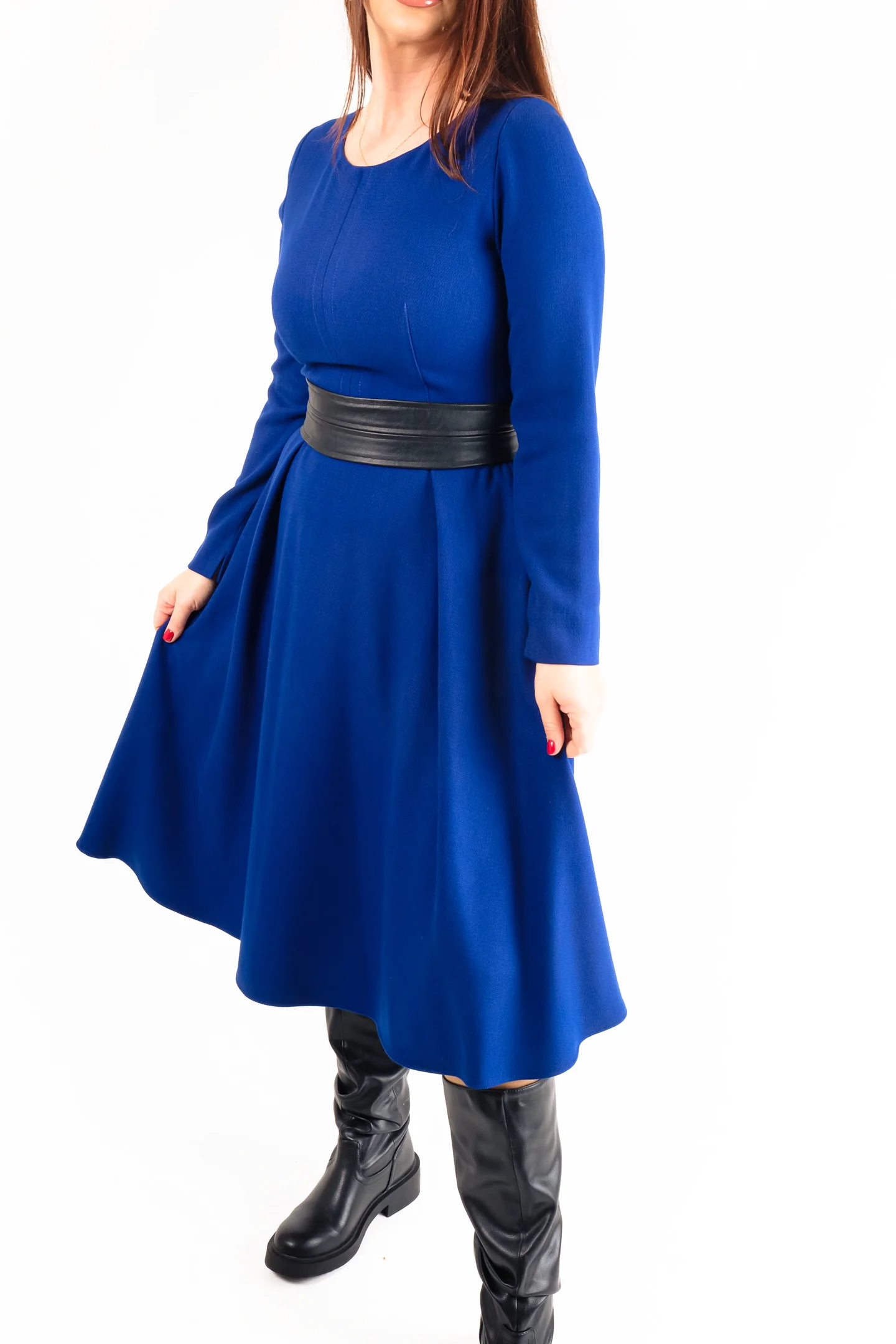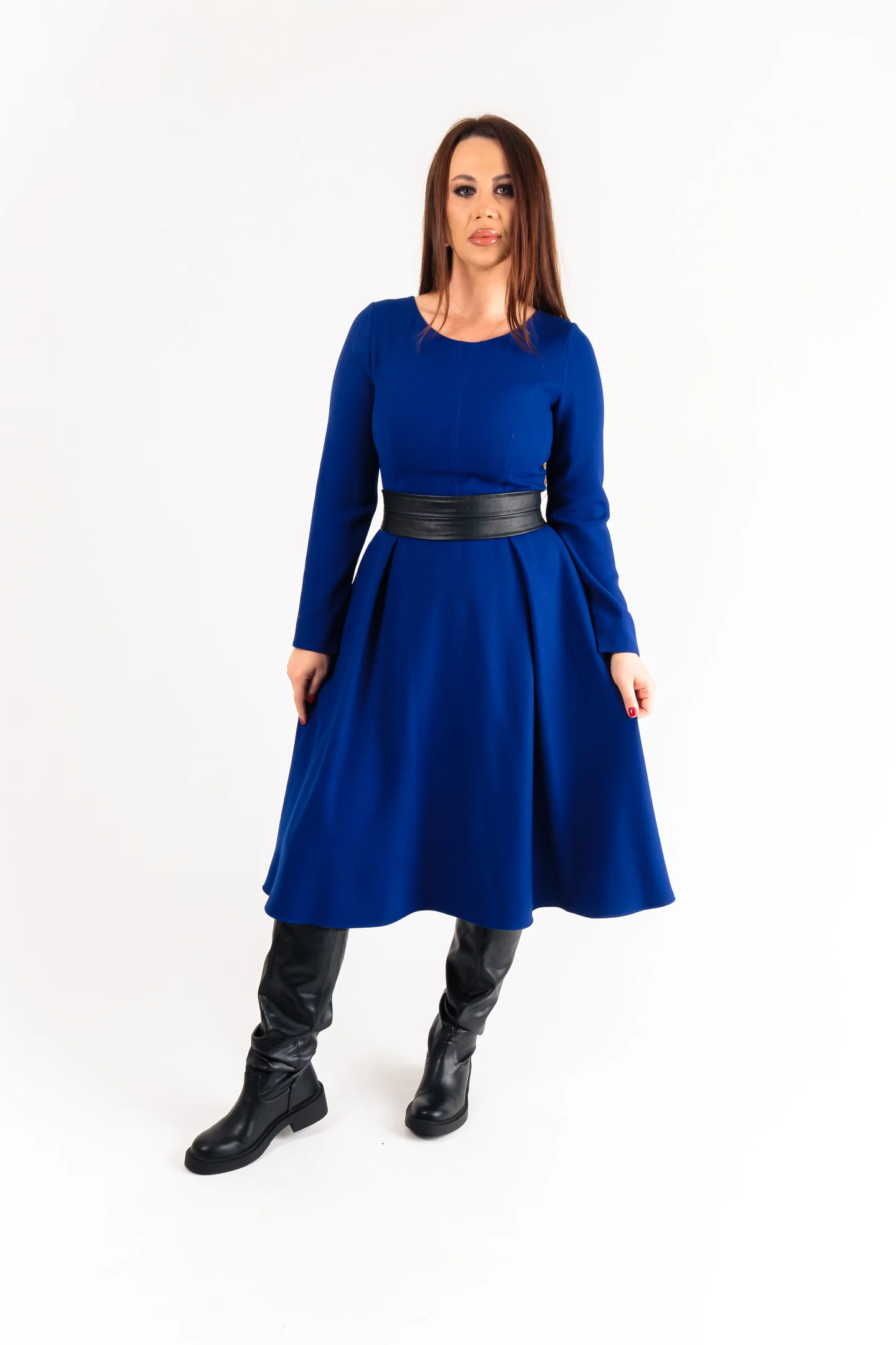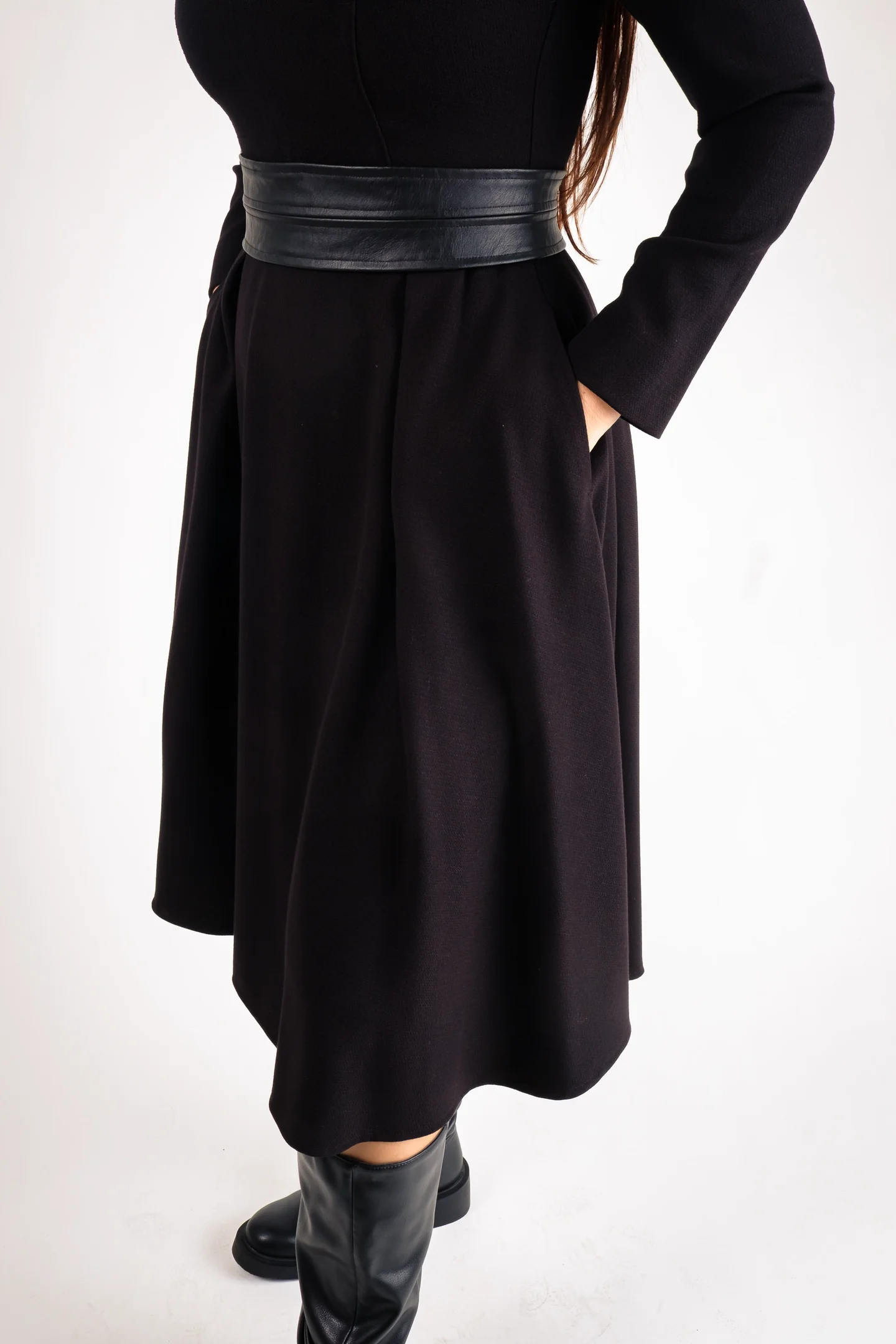 Rochie midi din jerse moale, cu croială lejeră și cordon din ecopiele ce accentuează talia. Potrivită pentru toamnă-iarnă, casual sau office elegant.