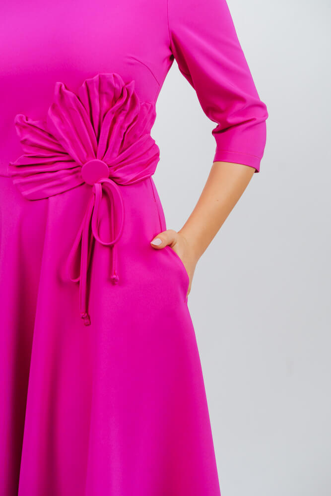 Rochie midi fucsia realizată din material plăcut la atingere, cu o croială ce evidențiază talia și conferă o siluetă armonioasă. Detaliul decorativ frontal, tip fundă plisată, adaugă un plus de rafinament.